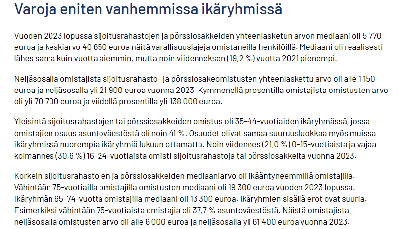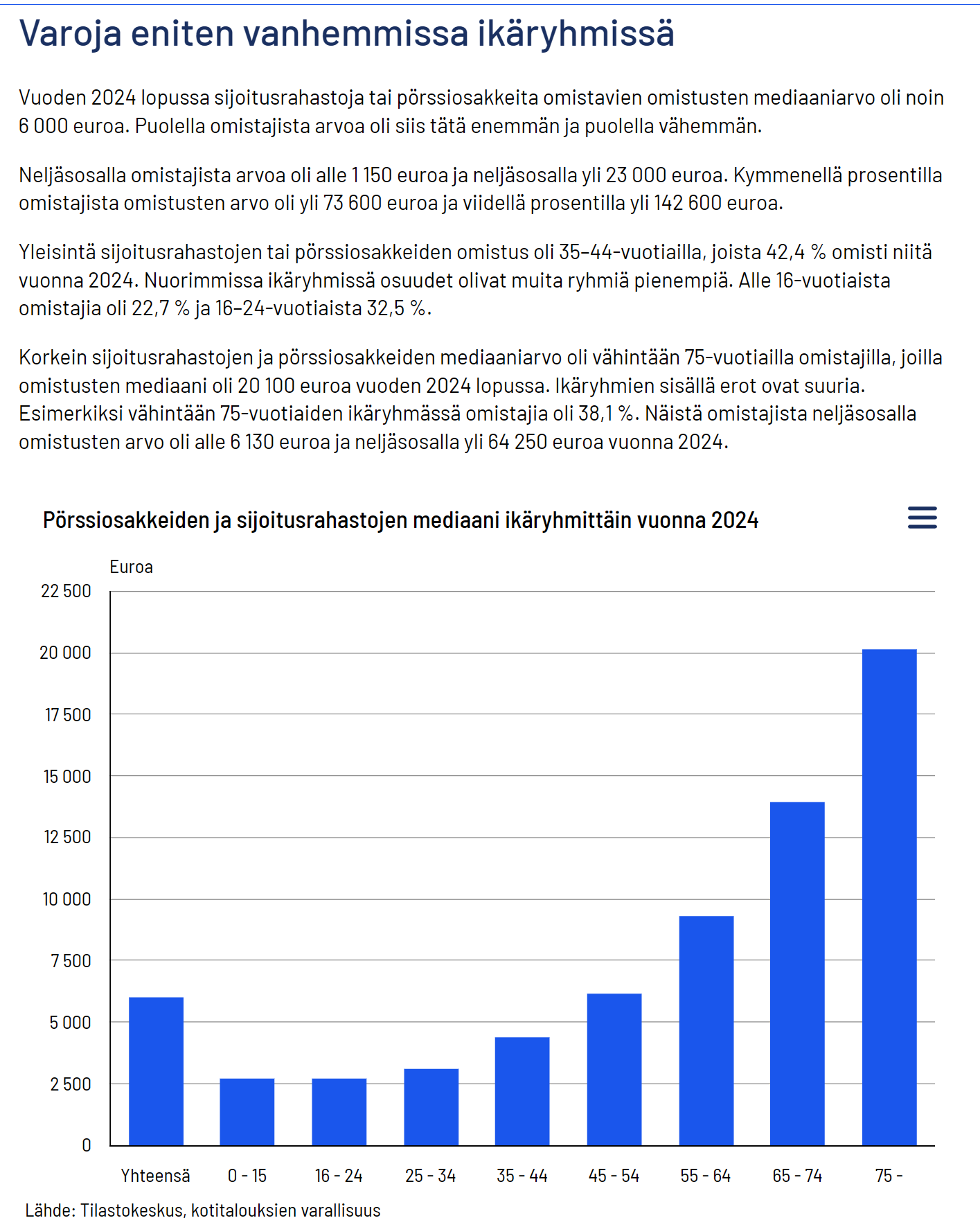 Mitä tulee tuohon tilastoon, että vanhemmilla ikäluokilla on enemmän varallisuutta. Muistan kun 30v. sitten lapset olivat pieniä, rakennettiin omakotitalo ja pitkälti elettiin yhdellä palkalla. Ei paljoa jäänyt ylimääräistä säästöön.