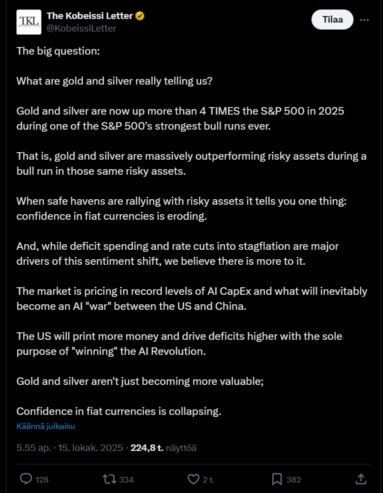 Det tyder enligt honom på att förtroendet för fiatvalutor vacklar, när skulden, penningtryckningen och AI-kapplöpningen mellan USA och Kina accelererar.