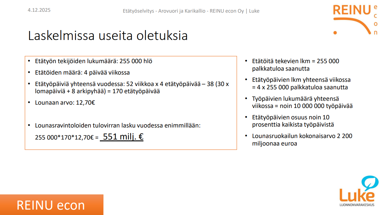I beräkningarna för lunchmåltider finns det verkligen flera antaganden. Jag vet inte hur denna doktor brukar bedriva forskning, men det skulle knappast klara en peer review. Bland annat verkar lunchvärdet vara ett momsbelagt värde (som inte är förlust för restaurangerna, syns inte ens i omsättningen). Det är också ett starkt antagande att ingen distansarbetare äter lunch utanför hemmet eller beställer lunch via Wolt (som jag åtminstone gör, kanske är jag ett statistiskt undantag).