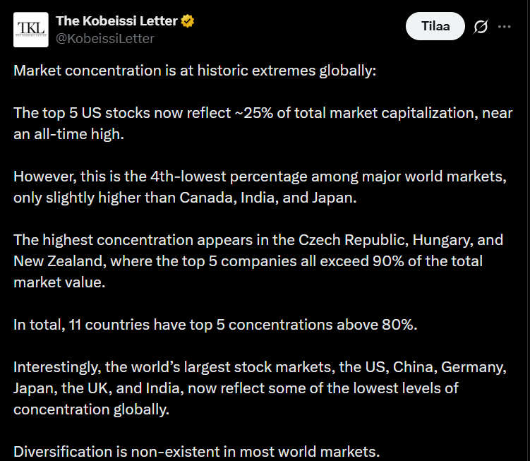 Tässä on tviitti siitä, miten eri maiden pörssit ovat keskittyneet.