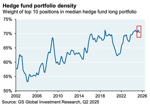 Hedge-rahastot ovat kasanneet keskimäärin noin 70 prosenttia salkuistaan kymmenen suurimman omistuksen varaan ja ostavat intsinä samoja AI-osakkeita ennätysmäisen tiheästi.