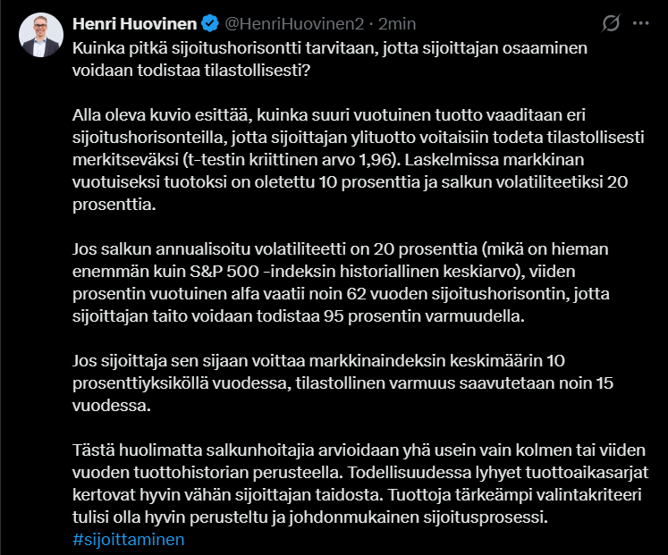 Henriltä hyvä tviitti siitä, että kuinka pitkä sijoitushorisontti tarvitaan, jotta sijoittajan osaaminen voidaan todistaa ainakin tilastollisesti. ![]()