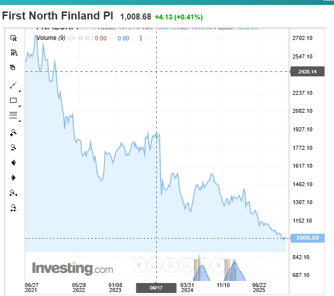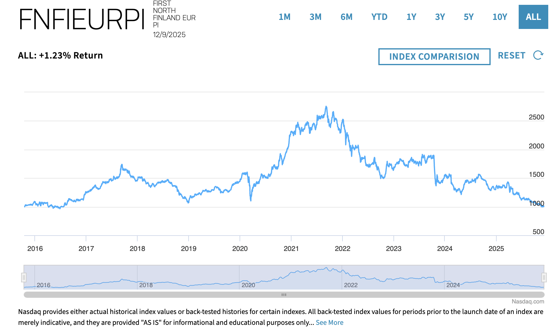 Indeksi, mihin kuuluu kaikki First North -listatut pikkuyhtiöt, on laskenut samalla tasolle mistä se aikoinaan 2015 lähtikin. ![]()