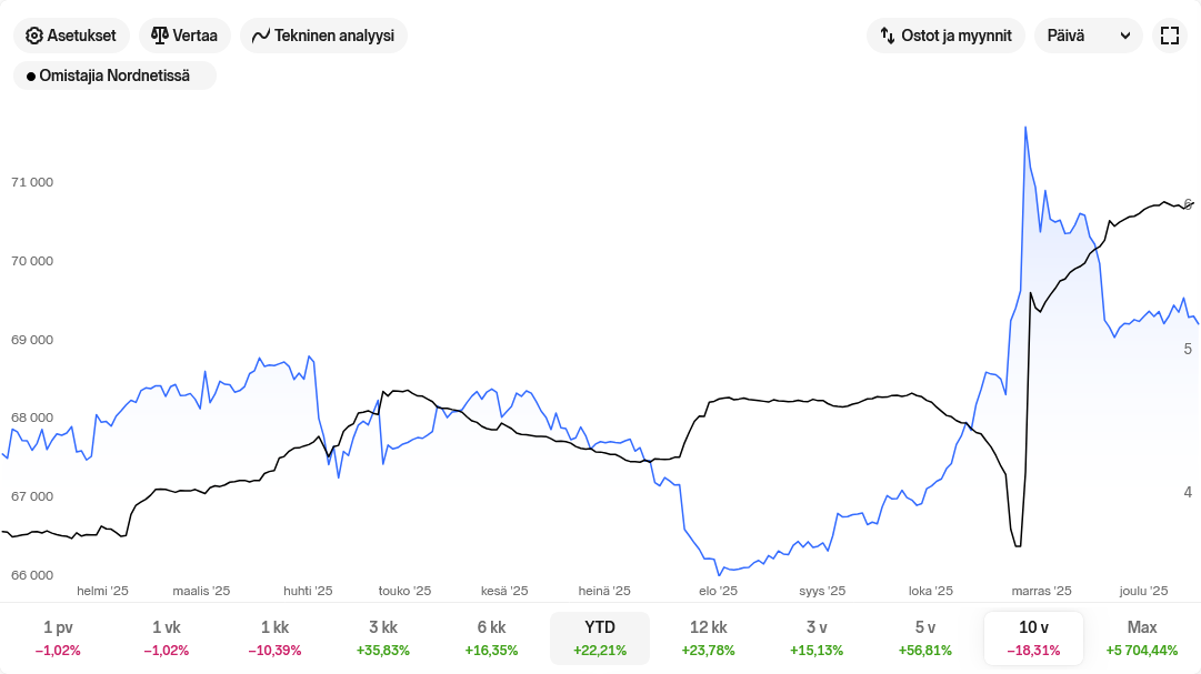 Jeg fandt en helt ny funktion i Nordnet, hvormed man kan sammenligne antallet af ejere i Nordnet med aktiekursens udvikling.
