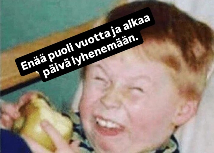 Mut tämä 21.12 on aina henkisesti iso päivä. Kyl se tästä. Alkuun 1-2 min lisää valoa päivittäin. Tammikuun lopulla huomaa jo selkeästi, kun päivä pitenee 4-7min.