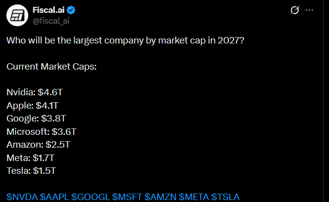 The tweet below contemplates which will be the largest company in 2027, featuring the familiar suspects.