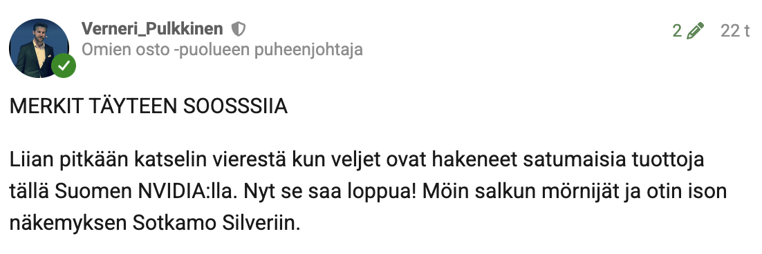 e: Kirjoitin kauniisti tarkoituksella saksaksi, niin foorumin tekoäly käänsi automaattisesti Suomeksi. Pöljä toiminto! ![]()