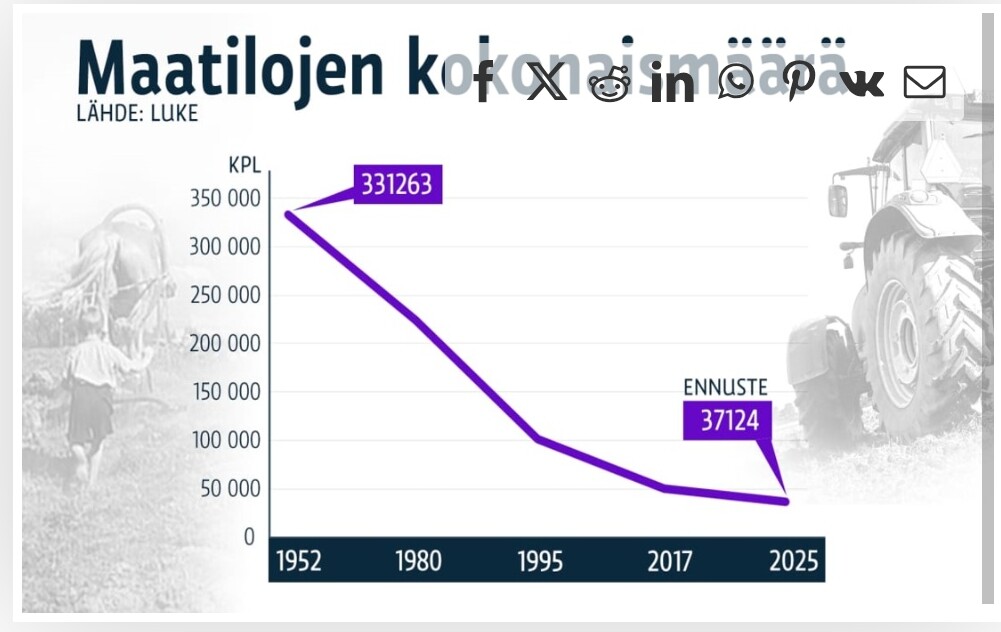 Aivan ei uusinta tietoa mutta tuosta selviää ruoka-alan merkitys Suomelle.Ajatuksen kanssa voi lukea ja miettiä mistä löydetään korvaavat työpaikat jos maatalous ajetaan alas.Pelkästään tukisummia päässään pyörittämällä ei taida oikeaa kuvaa saada.Montakohan uutta työtöntä Suomi kestää jos kaikki lopetetaan mikä aiheuttaa joillekin harmaita hiuksia.Suomessa toki mielipiteen vapaus ja itsenäisyys ( vielä ? ).