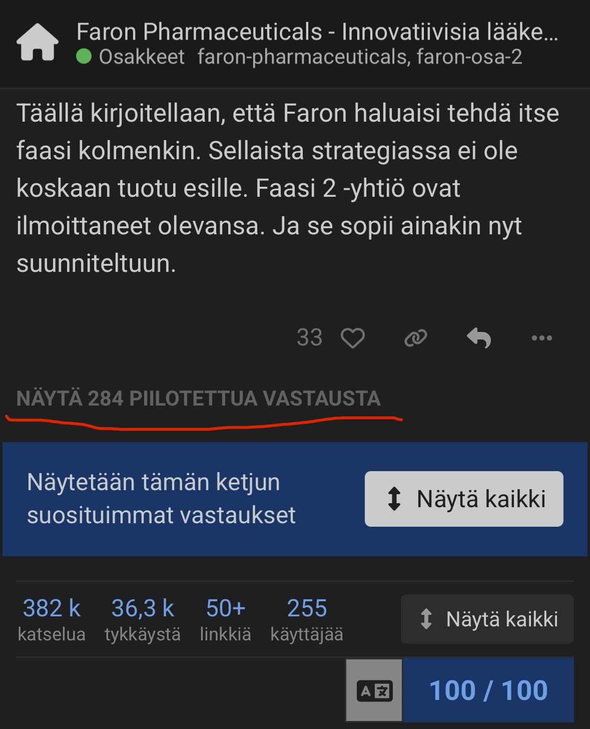 Sentimentet kring Faron börjar sitta där det ska, i tråden sägs det att aktien är värdelös, man hoppas att VD:n får sparken och drömmer om att den köps ut från börsen. Dessutom skrivs det mycket i tråden, men med lite substans. Vanligtvis har dessa varit bra köpsignaler på forumet.