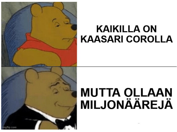 Poikkesin viime viikolla kainuussa ja ihastelin laadukkaiden autojen määrää. Parkkipaikoilla oli omaan silmään mukava määrä vanhempia (2010-2015) mersuja, volvoja, bemareita ja toyoja. Etelämpänä näkee valitettavan paljon uudempia autoja joissa tuntuu olevan enemmin yllätyksellisiä kuluja. Arvoansoiksikin niitä +20k€ koslia voisi kutsua, korkean arvonaleneman vuoksi.