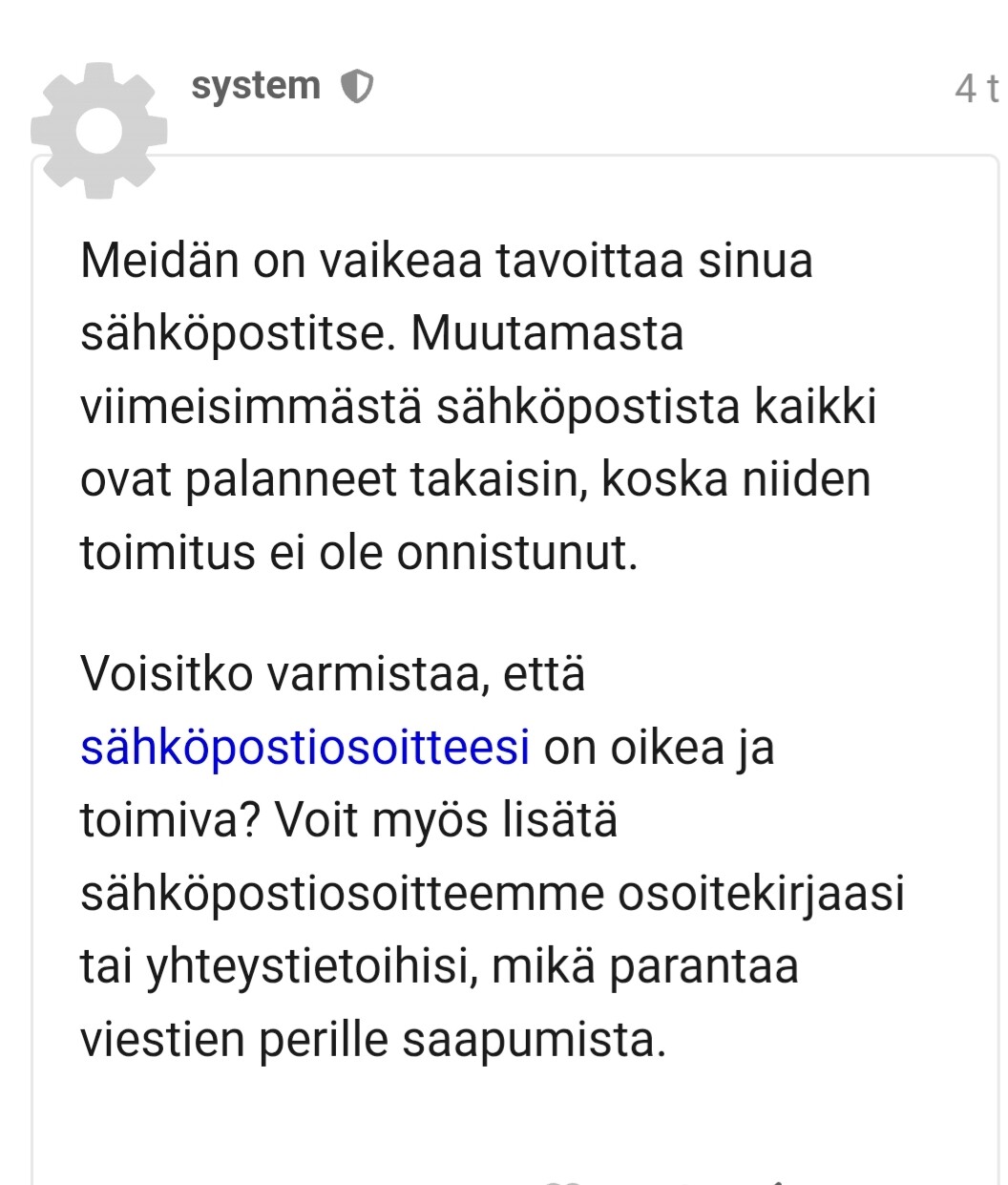 Onko muille tullut vastaavaa viestiä? Jossei sähköpostini ole kirjaimellisesti mennyt täyteen yön aikana jos se edes on mahdollista, niin lienee joku bugi sillä en ole sp osoitettani muuttanut ja aiemmin kaikki viestit inderesiltä on sinne normaalisti tulleet .