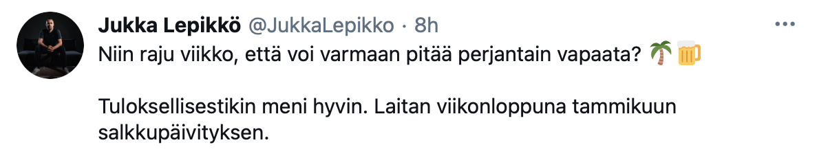 Näyttää Lepikkökin ottavan tänään taukoa markkinoilta. Varmasti fiksu veto jos on vähän päässyt oma pelikirja sekoamaan. Viikonlopun irtioton jälkeen varmaan taas parempaa analyysia asiasta, mielenkiintoista nähdä miten asiaa kommentoidaan ensi viikon Trader’s clubissa ![]()