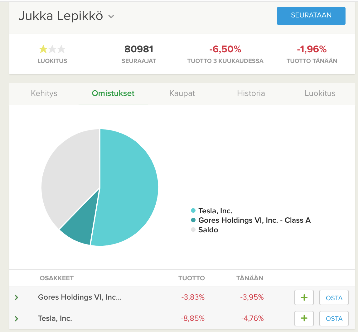 Eikös tuo ole Lepikön pienempi salkku, n. 30k€. Miljoona salkku on erikseen. Tuskin laittaisi omaisuudestaan puolta Teslaan.