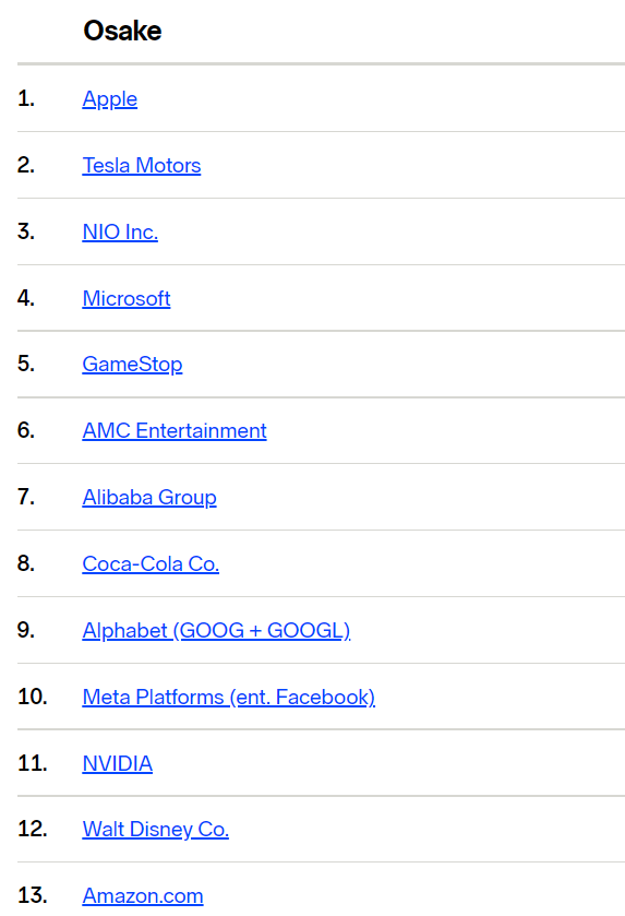 Kuvakaappaus Nordnetin sivuilta missä heidän kautta omistetuimpia USA:n osakkeita.