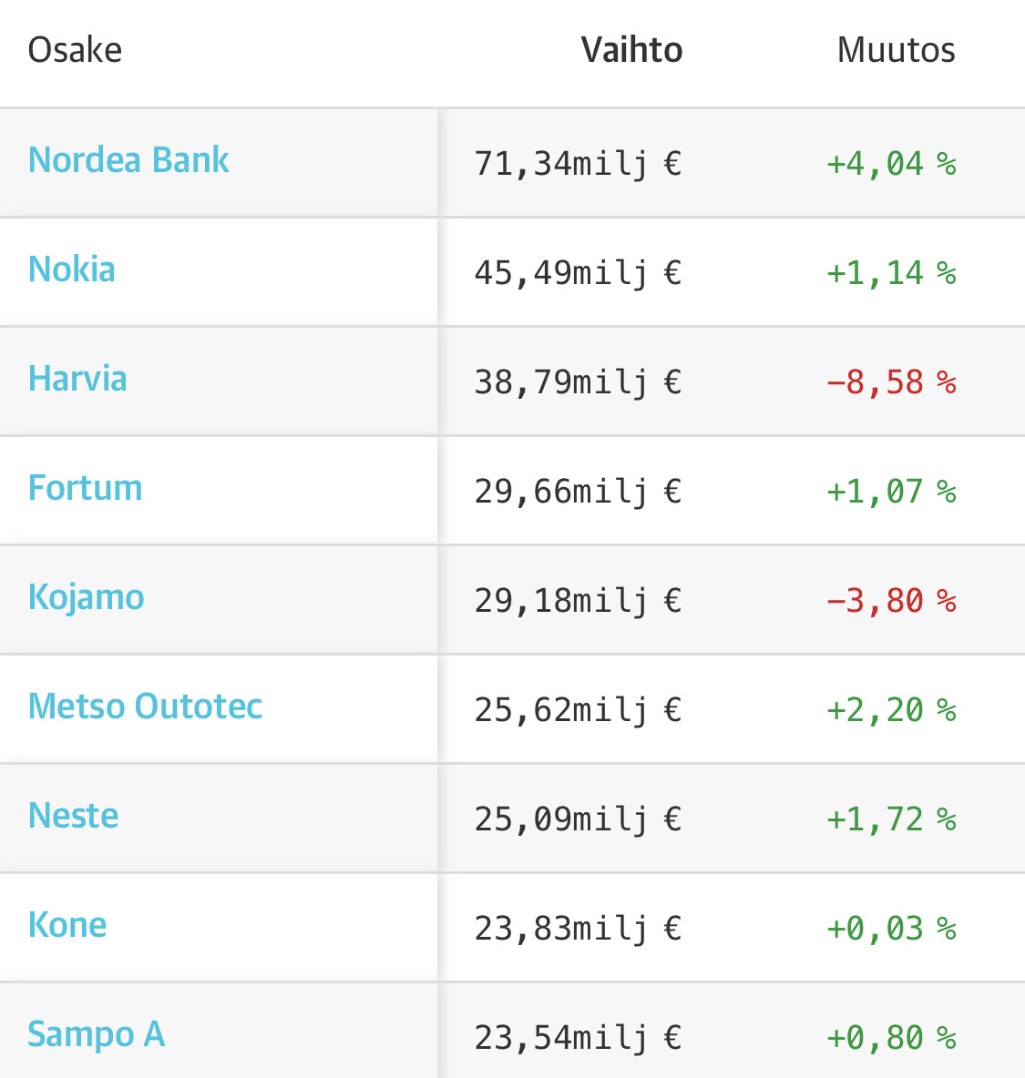 Harvia oli sitten päivän kolmanneksi vaihdetuin osake. Taakse jäi mm sellaisia pikkufirmoja kuin Fortum ja Sampo :grin: