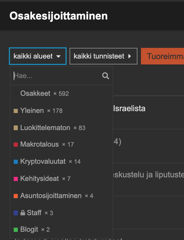 Aluejakoa kannattaa pohtia uudelleen. Rahastoille voisi tehdä oman alueen ja yleisen keskustelun voisi jakaa kahtia - sijoittamiseen liittyvä yleinen keskustelu ja muuhun liittyvä yleinen keskustelu.
