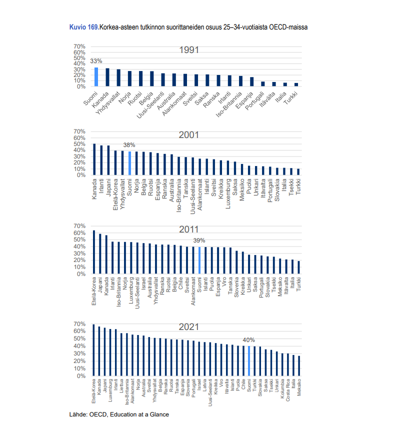 Helsingin pörssi on ollut yksi länsimaiden parhaimpia toisen maailmansodan jälkeen. Onko Suomessa kuitenkaan aineksia tulevaan kasvuun? Alla mielenkiintoinen kuva korkeakoulutettujen osuudesta 25-34 -vuotiaiden keskuudessa. Suomi jäänyt muiden OECD maiden kelkasta.