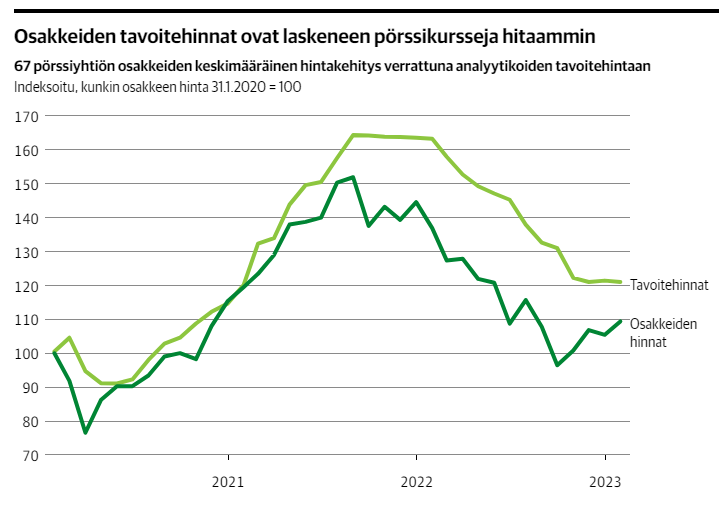 Aiempaa edullisempi hintataso näkyy analyytikoiden yhtiöille antamissa tavoitehinnoissa. Ne ovat tyypillisesti keskimäärin muutaman prosentin pörssinoteerauksia korkeampia, koska markkinoilta on perusteltua odottaa kasvua.