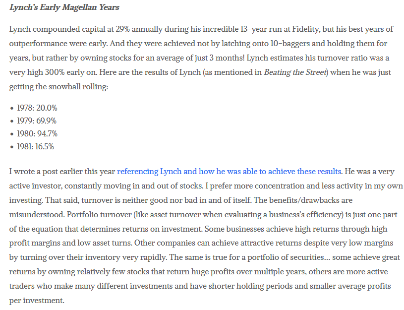 Varsin erinomainen muuten tuo analogia yksittäisten yhtiöiden ja portfolioiden välillä. Korkean tuoton voi saavuttaa nopeammalla kiertonopeudella tai korkeammalla “marginaalilla” molemmissa. Lynchmäistä träkkiä voi tuskin portfolioon rakentaa ilman kohtuullista kiertonopeutta. Muuten se vaatisi hurjaa keskittymää johonkin superstonksiin - nämä ovat äärimmäisen harvinaisia, sekä tuollaisen 13 vuoden 29% CAGR kyydissä pysyminen vaatisi lisäksi melkoisia timanttikäsiä