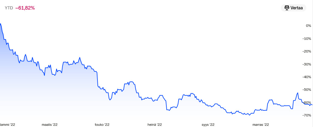 Koska minulla ei ole mitään mainetta menetettävänä, imagoa tai egoa ylläpidettävänä, vaan voin tuoda häpeäni kaikkien katsottavaksi ja paljastaa YTD lukuni graafina. Ja kun häpeä on paljastettu kaikille, sitä ei tarvitse enää hävetä, eikös? Pieniä toivon kipinöitä siellä täällä, mutta tarkkasilmäiset voivat huomata 16.10.2022 saavutetun ehdottoman Low-pointin YTD arvon ollessa -69,9%. Sen jälkeen on alkanut lähes huomaamaton pikkuhiljainen kipuileva nousu, jossa - kuten ripulissa - tulee pikku pyrähdyksiä ja sen jälkeen taas vedetään henkeä. Voisiko karhumarkkinan pohjat olla siinä? Aika näyttää.