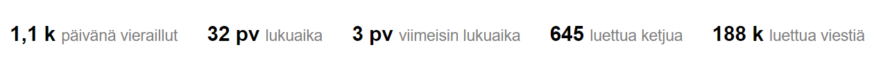 Mistä voi seuloa paljonko vaikka kukakin on lukenut viestejä viimeisen vuoden aikana? Olisi kiva verrata noihin heavy-usereihin:) tää alla oleva tilasto taitaa olla koko käyttäjä historia?