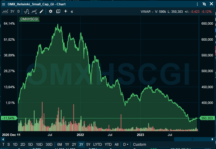 En ole kategorisesti karhuilua vastaan ja voin suoraan hyväksyä sen argumentin, että jotain mahdollisesti menee vielä yllättävällä tavalla rikki korkojen liiallisen vauhdikkaan kiristämisen seurauksena ja talous romahtaa. Alkuvuodesta olin aika vahvasti karhuna ja hävisin paljon rahaa, mutta muutin kesällä mieleni, kun todellisuus ei jostain syystä näyttänyt tottelevan lähtöoletuksiani. Nykyään olen Euroopan osalta vahvasti sonnina, vaikka Yhdysvalloissa tuo kurssitaso näyttääkin suuryrityksen osalta olevan suhteellisesti liian korkealta. Pienet yhtiöt ovat sielläkin hyvin edullisia.