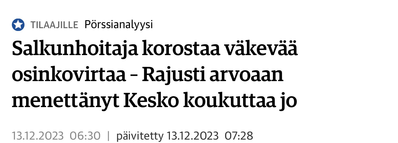 Sinänsä samaa mieltä, mutta toisaala olen miettinyt että 5-6% osinkovirtaa luonnehditaan hieman liikaa valtavaksi. Jos osakkeen tuotossa luottaa pääosin osinkoon (buy and never sell) niin Hesulissa on taas yhtiöitä joiden osinkovirtaodotus on jopa 50% suurempi kuin Keskon. Termit saattaa vääristyä itse kukin päässä kun miettii 5,6% vs. 8,8% tai muuta vastaavaa. Ero on kuitenki tosi iso jos laskee osinkojen varaan.