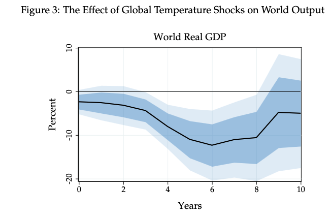 Lukasin paprun lävitse ja tuossa on ilmeisesti arvioitu toisen maailmansodan jälkeisiä historiallisia paikallisia lämpöshokkeja (lämpötilamuutos poikkeanut trendistä) ja pyritty mittaamaan miten tuottavuus on muuttunut. Sitten tämä paikallisista lämpöshokeista saatu data on yleistetty mallina globaaliin talouteen ja saatu tuo johtopäätös että 1 asteen muutos tiputtaa maailman bruttokansantuotetta 12 %, kun tuottavuus laskee.