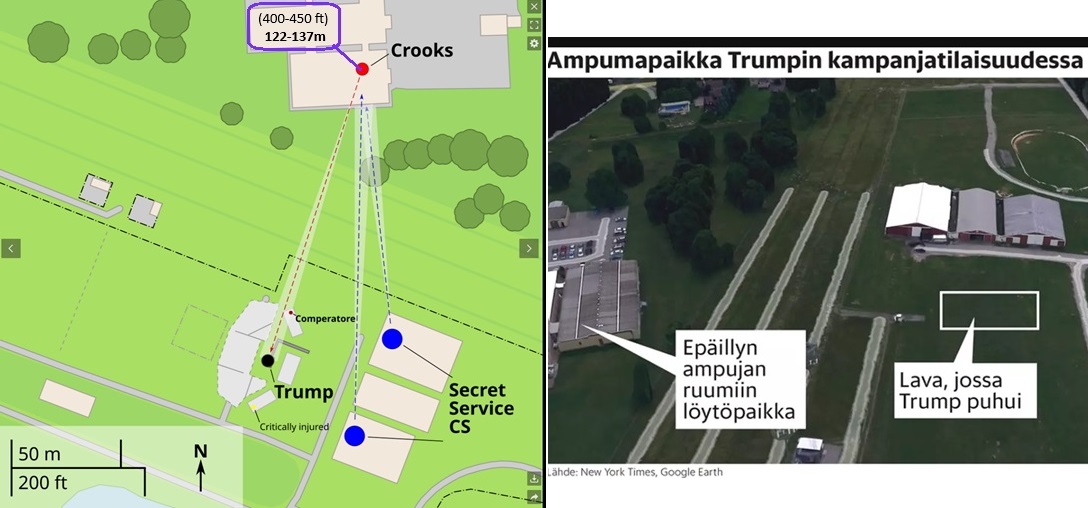 Edit: Laitetaan nyt tasapuolisuuden nimessä myös Trumpin salamurhayrityksen etäisyys, tosin en löytänyt tarkkaa mittaa mutta 121-137m:n haarukka löytyy Wikipediasta (eng.):