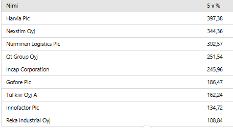 . Tässä on viiden vuoden kovimmat nousijat (jos osasin oikein ottaa), pl. ne jotka ovat tulleet alle viiden vuoden sisällä pörssiin. ![]()