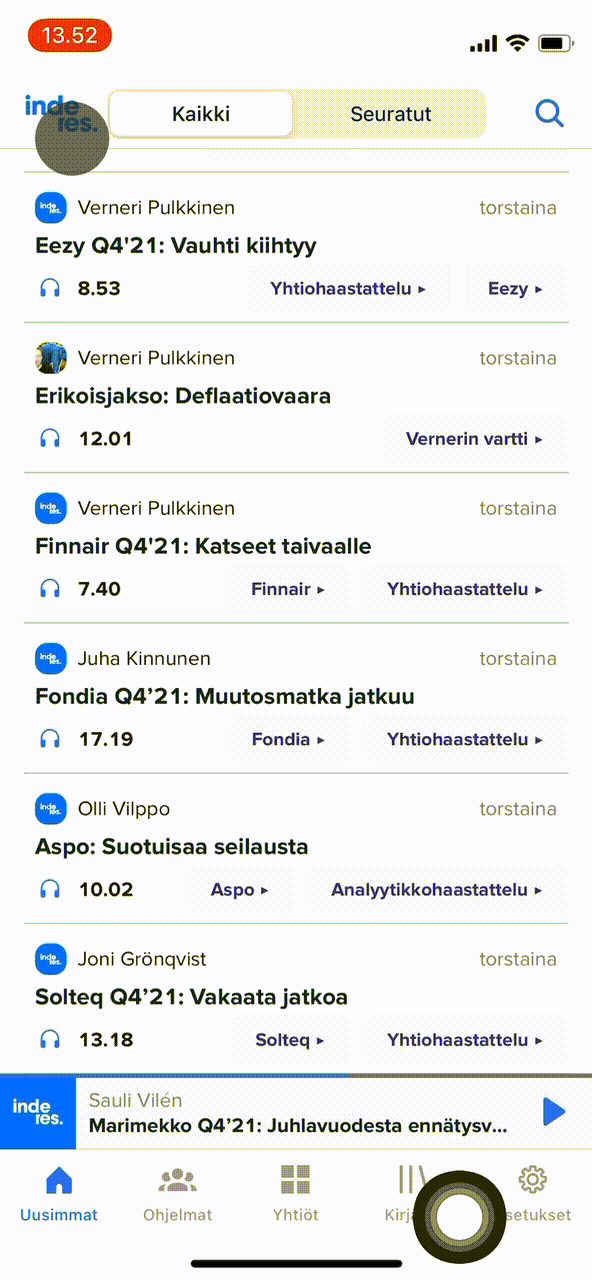 Android ja iOS -puhelimille sovellus, jolla pystyt kuuntelemaan Inderesin tuottamaa sisältöä vaivattomasti puhelimellasi. Seuraa valitsemisiasi ohjelmia ja yhtiöitä, ja kuuntele sisältöä ruutu suljettuna olit sitten kävelyllä, auton ratissa tai salilla! Pysyt ajan tasalla seuraamiesi yhtiöiden uusimmasta sisällöstä suorilla notifikaatioilla.