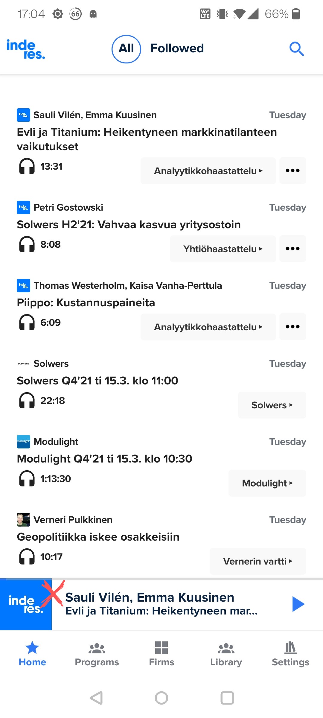 Lisäämme kaiken tulevan sisällön sovellukseen, mutta Inderes-TV:n koko 5+ vuoden arkistoa metatietoineen ei lisätty teknisistä syistä johtuen. Valitsimme kaiken sisällön viimeisen 6kk ajalta, suosituimmat ohjelmat (inderesPodi, Heikkilä&Vilen) sekä yhtiöiden omat esitykset Videosyncistä. Jos jokin mielenkiintoinen nauhoite puuttuu, laita minulle viestiä!