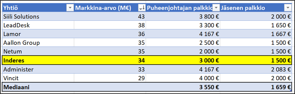 Below is a selection of comparable companies of similar size. Furthermore, it should be noted that some of the comparable companies have not yet made proposals for the 2025 Annual General Meeting, so their remuneration levels depicted in the table may still increase for the next period. Additionally, some companies have various committees or similar bodies for which additional compensation is paid. Inderes’ Board of Directors does not have committees, which is why all payable remunerations are shown in the table.