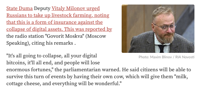I Rusland mestrer de den bjÞrnestil pÄ en helt anden mÄde end vi i de dekadente vestlige lande. NÄr Bitcoin kollapser, har den kloge russer allerede i tide flyttet sine alternative investeringer fra gÄrsdagens kryptovalutaer til en ny-retro ko-Þkonomi, som endda giver dem lÞbende reelle udbytter ![]()