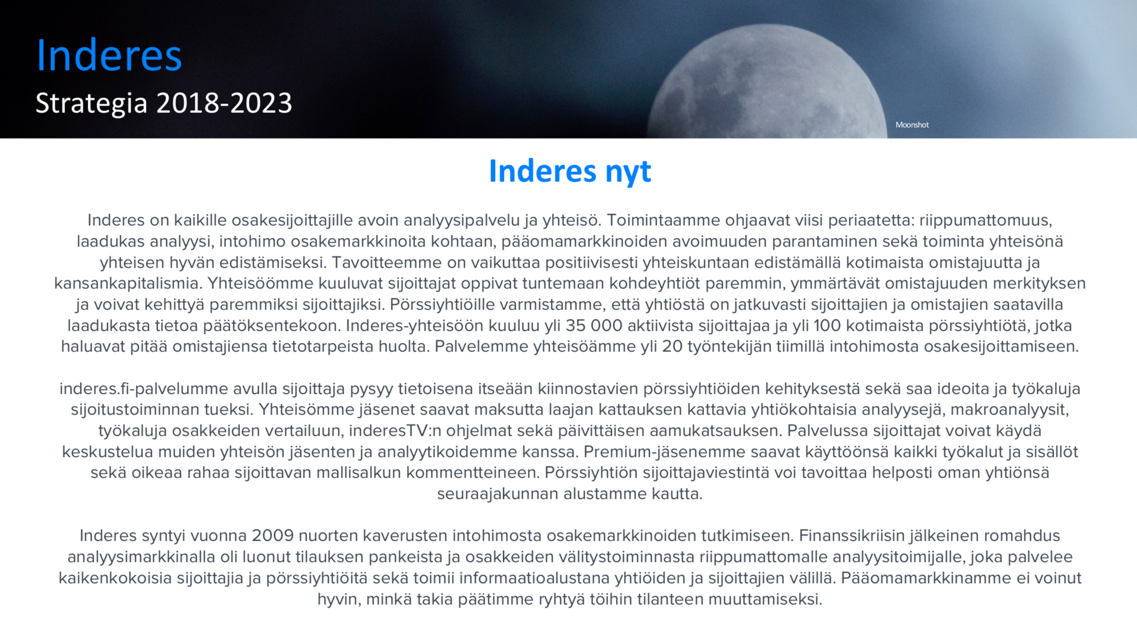 Päätimme avata meidän strategiaa sijoittajayhteisölle, jotta yhteisö näkisi paremmin, mihin Inderesiä ollaan viemässä. Tässä ketjussa voi antaa vapaasti palautetta ja ideoita strategiaan liittyen. Teitä sijoittajia vartenhan tätä työtä viime kädessä tehdään.