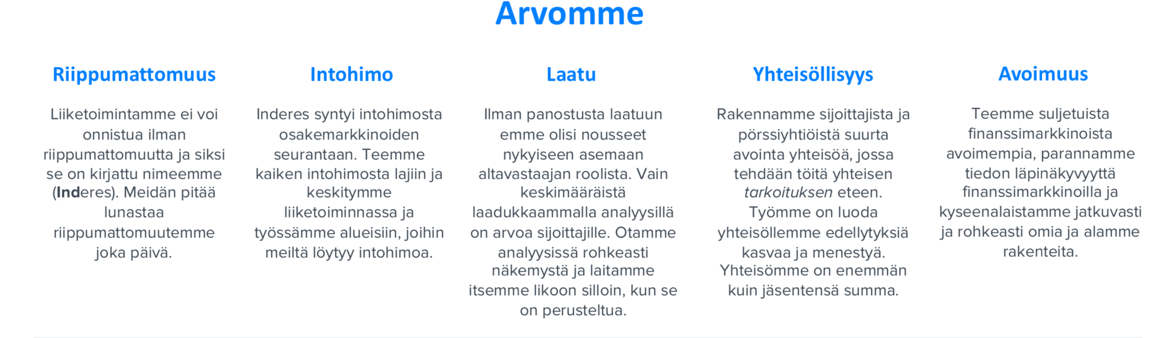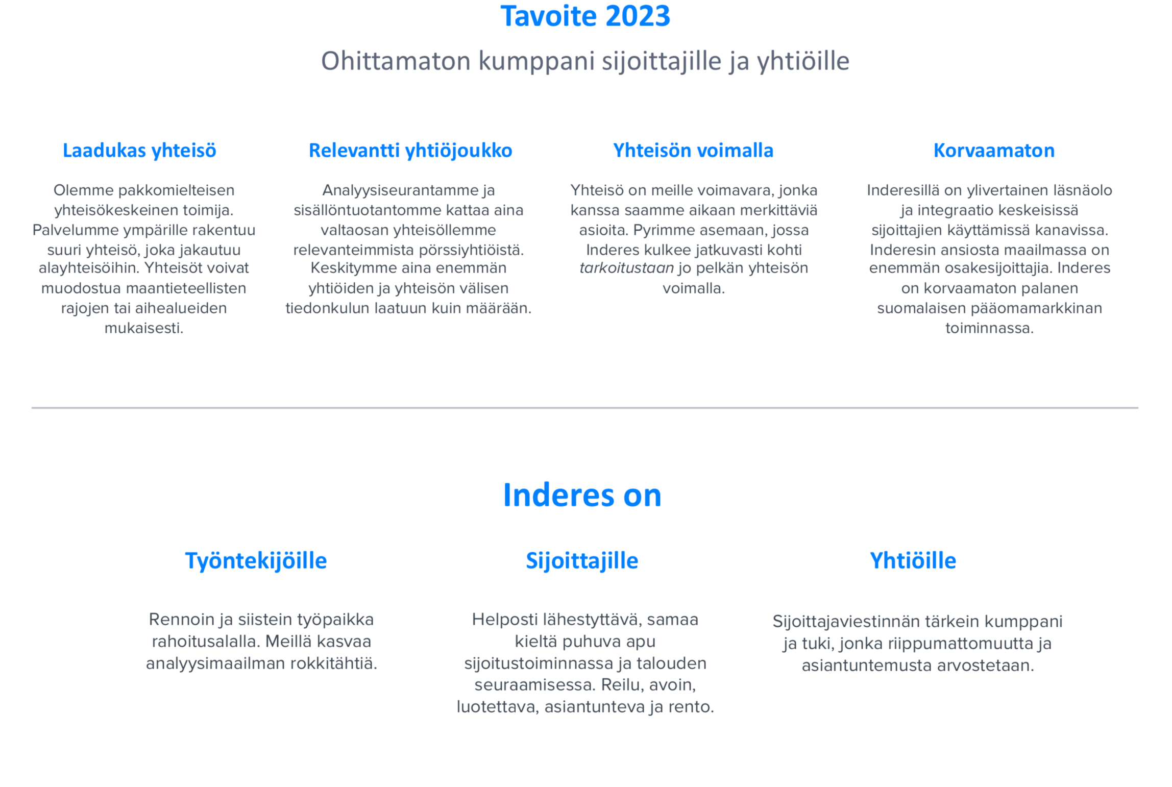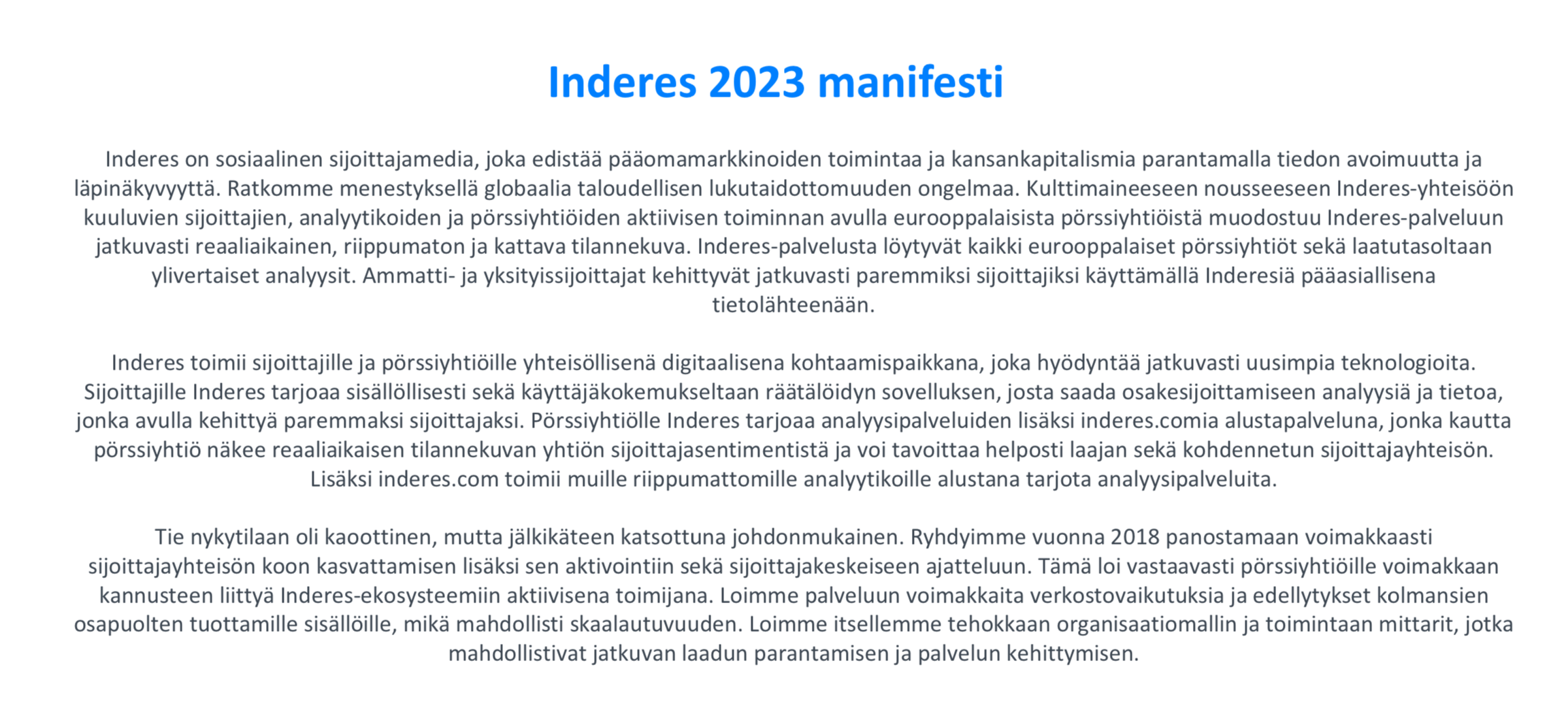 Jag skulle vilja se Inderes utmana traditionella ekonomimedier på deras egen mark. De nuvarande ekonomimedierna är alla fulla av fel. Det skulle stödja ert uppdrag att ge finska folket mer högkvalitativ information om företag och marknader i allmänhet.