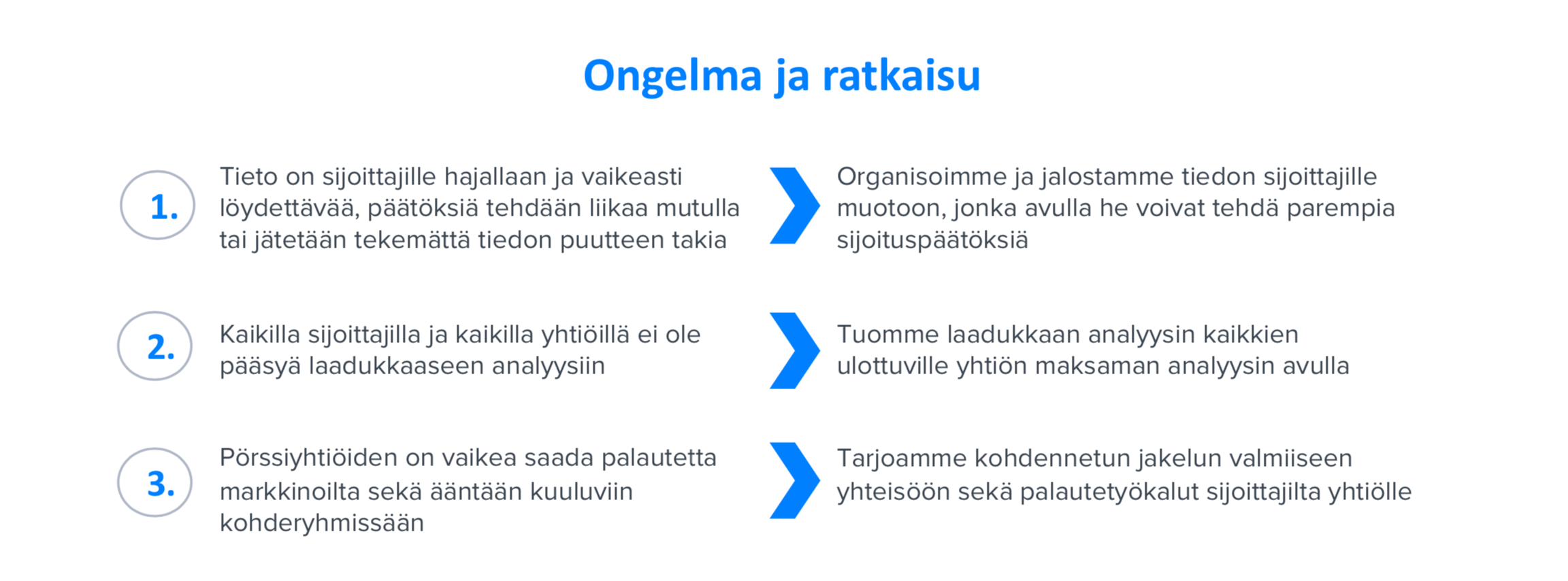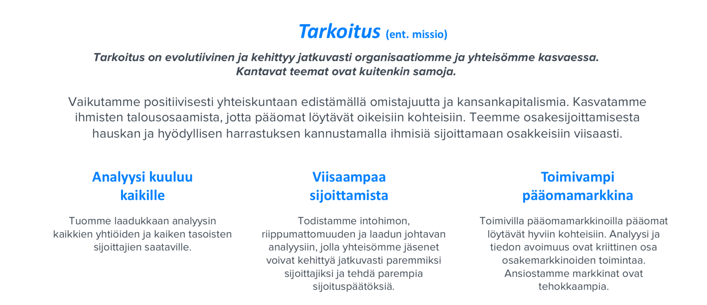 Målet är alltså att föra in ett bredare utbud av företag i vår tjänst, även på europeisk nivå, så att investerare får användbar information om företagen. Detta är naturligtvis inte realistiskt att uppnå med en “traditionell” affärsmodell genom att rekrytera nya analytiker och öppna kontor. Målet är ambitiöst eftersom det i sig tvingar oss att tänka helt nya sätt för en liten aktör att med begränsade resurser på kort tid uppnå en betydande effekt. Naturligtvis är utnyttjandet av teknik, nätverkseffekter och gemenskap (kollektiv intelligens) avgörande här. Vi kan förverkliga vår idé att fungera som en plattform mellan investerare och företag (och skapa värde för investerare) förutom analys även på många andra sätt – utan att underskatta analysens roll. Vi menar alltså inte att varje europeiskt företag skulle ha en djupgående analys som leder till en rekommendation, utförd av en professionell analytiker, i vår tjänst. För tydlighetens skull, vi tror inte heller att en professionell analytikers arbete helt skulle kunna ersättas med teknik.