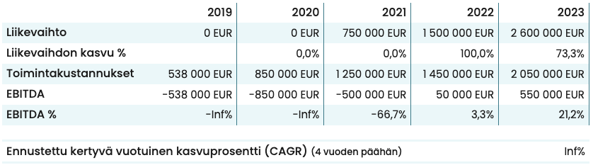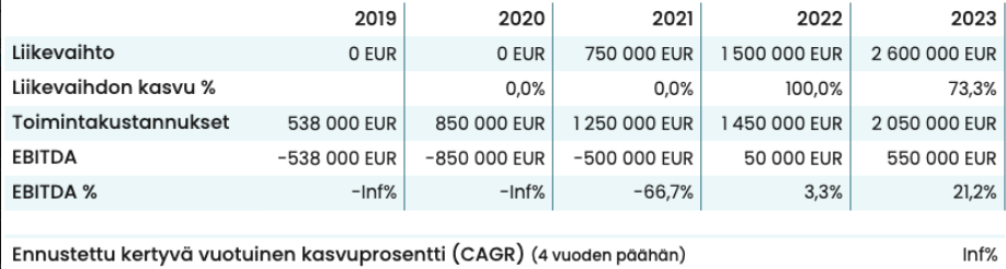 2020 kerätyn kierroksen (2 miljoonaa€) yhteydessä pre-money valuaatio oli 11 560 569€
