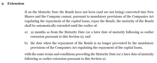 Eli jos (ja kun) yrityksellä ei ole 31.3.2024 vapaata pääomaa maksaa vaihtovelkakirjalainaa takaisin korkoineen, niin VVK-ehtojen kappaleen 9 mukaan tulee 12:n kuukauden pidennys laina-aikaan.