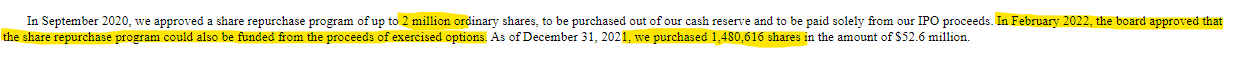 “The net proceeds received from the IPO were approximately $69,784,000”. Buybackehin käytetty nyt $52,6 m. Valtuutusta jäljellä 519 384 osaketta. Eli tämän hetken noteerauksella IPO-varat eivät riitä kaikkiin valtuutettuihin buybackeihin
