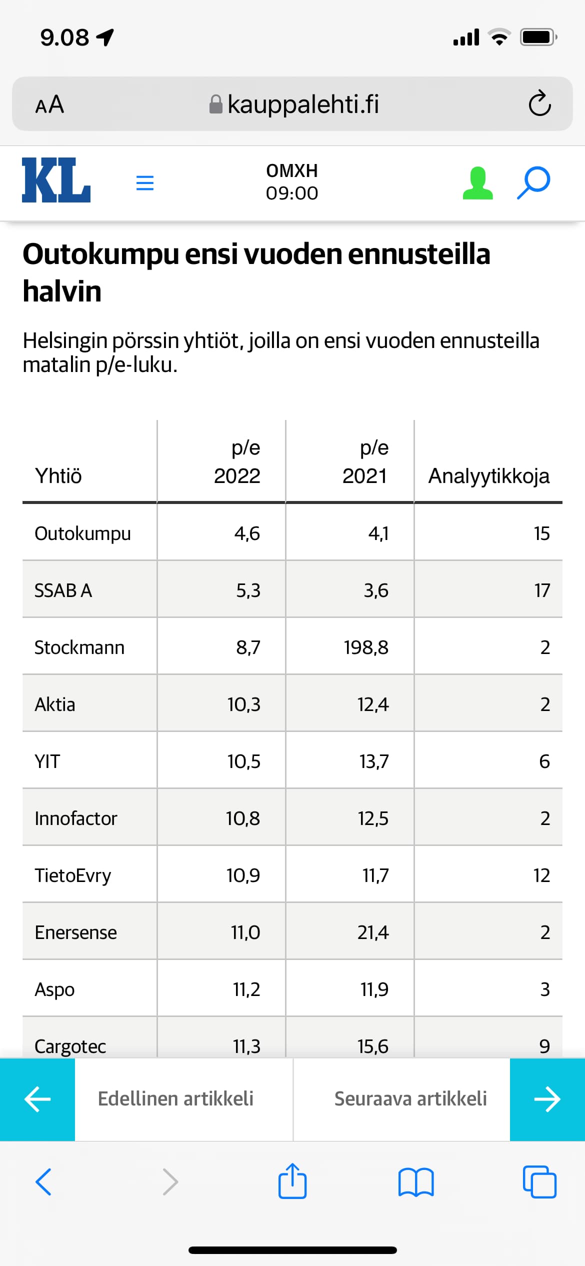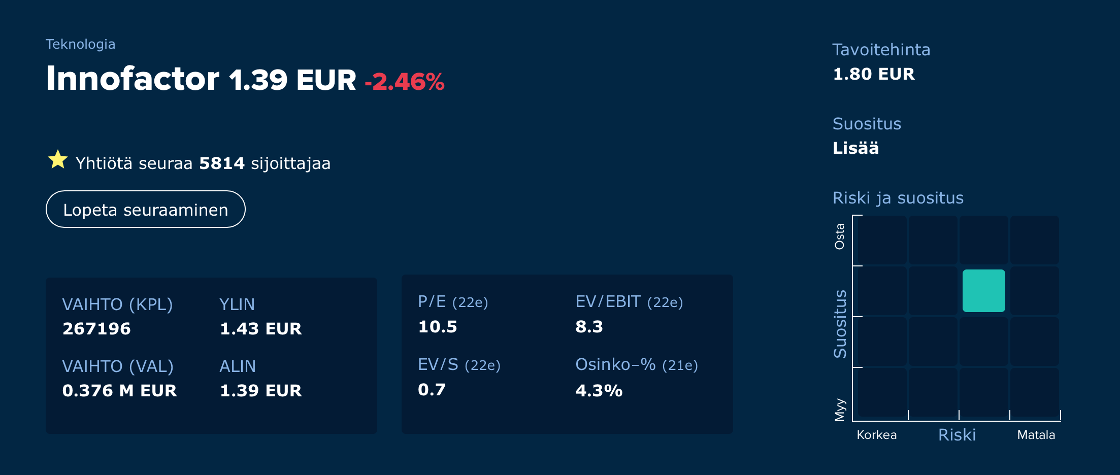 Hur är det med resultatets kvalitet? När vi tittar på Innofactors fria kassaflöde har det vuxit utmärkt till följd av resultatvändningen, till exempel från 2020 till 2021 (år 2020 var det fria kassaflödet 3,5 MEUR och år 2021 kommer det sannolikt att hamna på åtminstone något över 7 MEUR). Rörelsekapitalet eller dess betydande förändringar kommer inte heller att orsaka problem för Innofactor, enligt nuvarande bedömning. Som tidigare nämnts här, enligt Inderes nuvarande prognos, kommer Innofactors fria kassaflöde för 2022 att minska betydligt från 2021 års fria kassaflöde, men detta beror på skattebetalningar och inte alls på att företagets resultat skulle försämras så mycket.