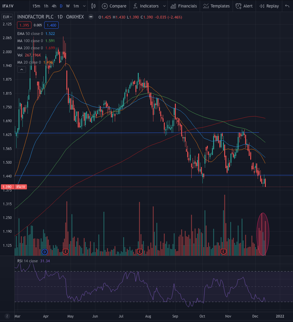 Ensam säljare (Rimonne), avmattning bland Nordnet-användare, skatteförsäljningar. Mycket har hänt nu, men jag är inte medveten om att företaget skulle ha upplevt en sådan vändning i sin verksamhet som kursen antyder. Men detta gäller ju inte bara Innofactor, till exempel har Solteq fallit lika mycket. Det kommer nog att göra ett rejält skutt uppåt vid bara en god nyhet, vare sig det är en order eller en resultatpresentation eller något liknande. Och det som lugnar sinnet lite är att vi tydligt har nått nivåer där även utländska investerare har börjat köpa (bl.a. MSE). Nu finns det möjlighet att köpa en stor mängd aktier utan att kursen drar iväg uppåt.