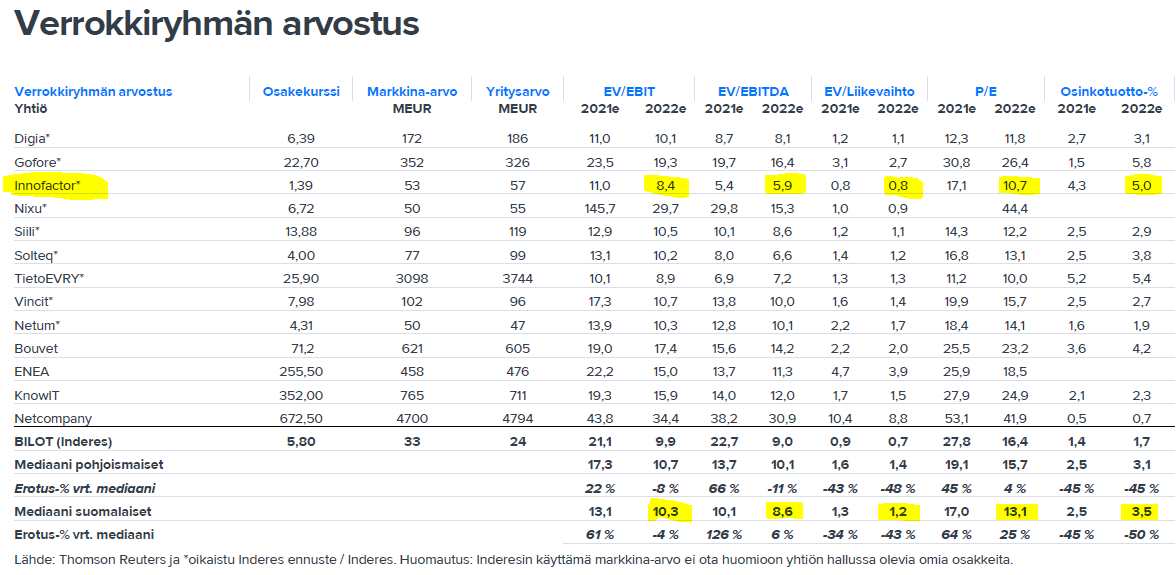 Jämfört med inhemska jämförbara bolag är Innofactor billigt enligt flera mått. Bild från Bilots analys i morse.