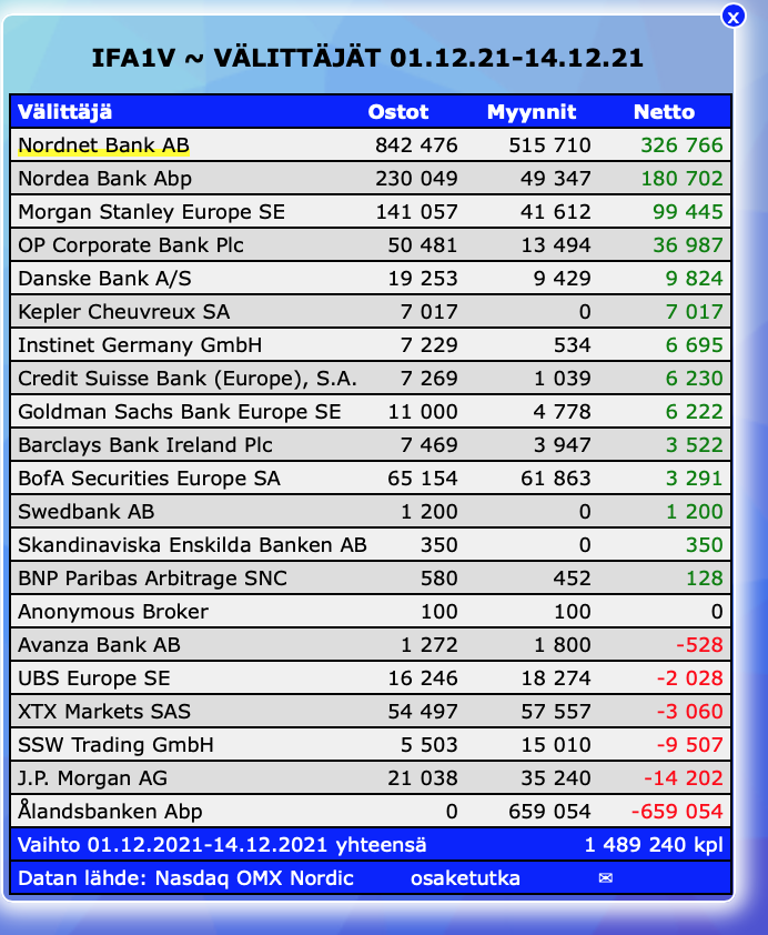 Detta är direkt relaterat till dessa AAL-försäljningar, om någon undrar varför AAL panikartat dumpar aktier. Det handlar om tvångsförsäljningar i samband med nämnda ärende, där värdepapper måste omvandlas till kontanter. Sällan kan dessa saker göras vid en “förnuftig” tidpunkt, utan när man måste, så måste man. Det var lätt att kontrollera med aktieanalysverktyget att när Hallikainen köpt har AAL varit mäklare. Så det är också lätt att gissa att Hallikainens miljon aktier nu flyger ut. Sedan har det funnits tillräckligt med stor-säljare, så jag antar att situationen kommer att lugna ner sig för en gångs skull.