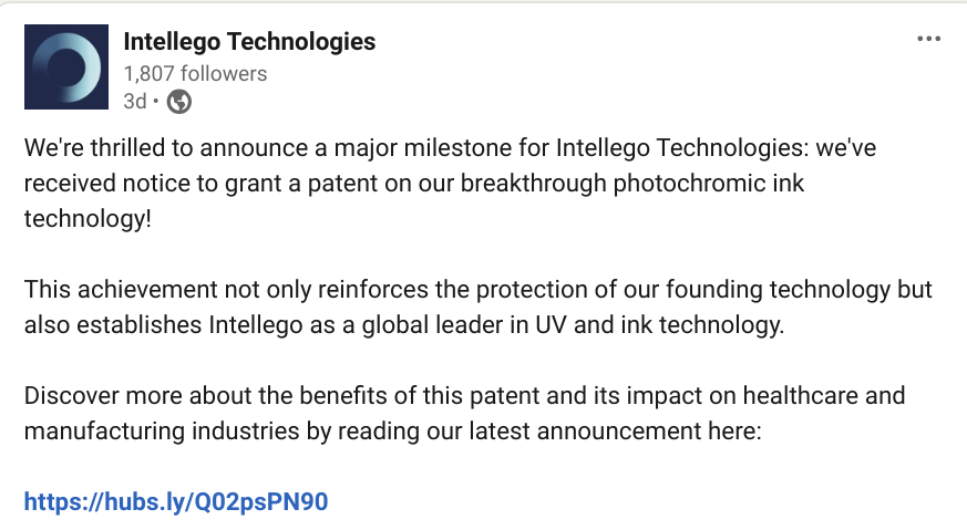 On January 26, 2024, Intellego announced that it and one of its curing partners — a leading global multinational —were conducting a global market evaluation for a category of Intellego’s curing dosimeters.