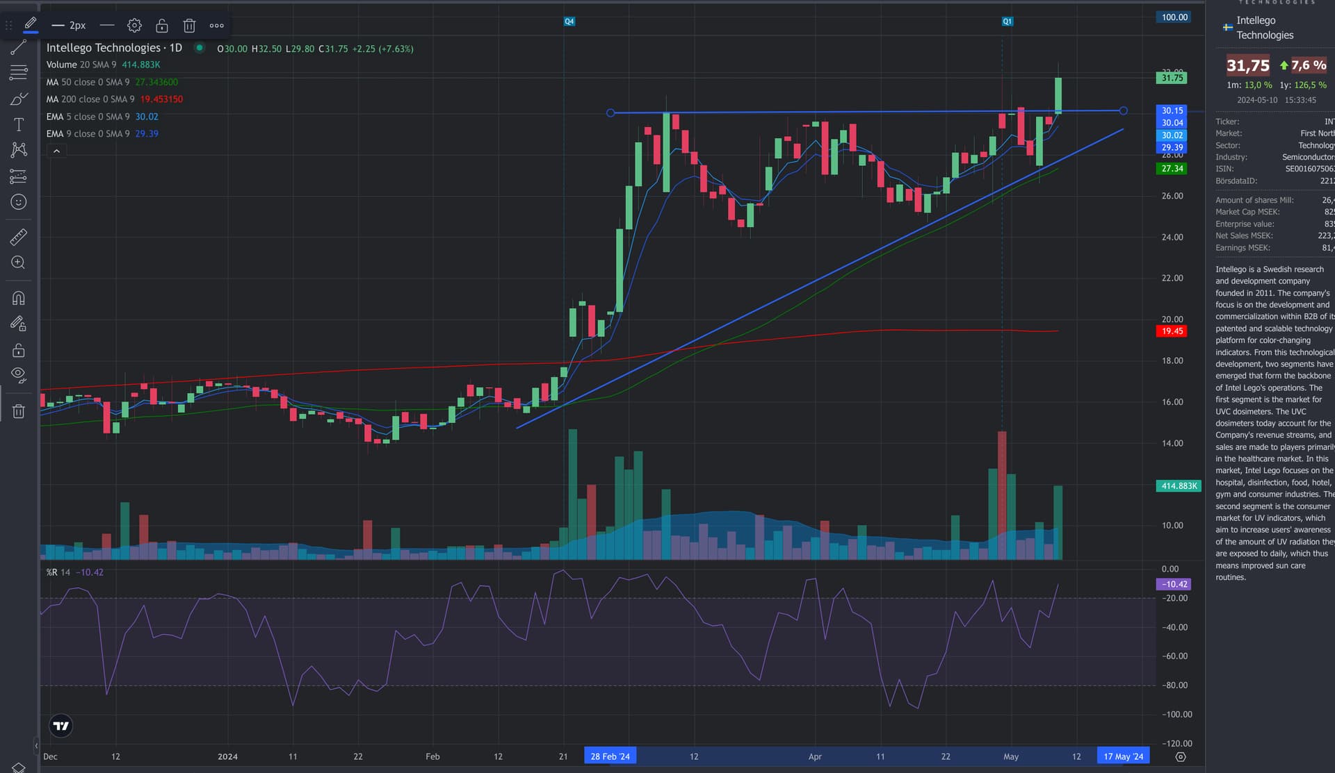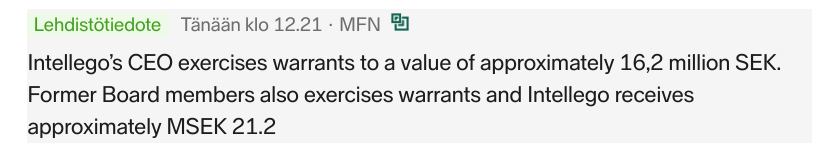 Intellegon toimitusjohtaja ostanut firman osakkeita 36 000 kappaletta noin 1 miljoonalla kruunulla. Omistaa tällä hetkellä 3.3 miljoonaa osaketta. Ihan hyvä merkki. Kurssi noussut pikkuhiljaa Henkel sopimusta odotellessa.