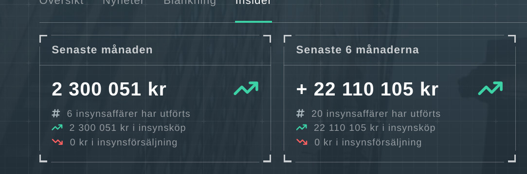 Luottosopimus Nordean kanssa valmis ja toimitusjohtaja ostanut taas osakkeita. Viimeisimmän kuukauden aikana sisäpiiri (toimitusjohtaja) ostanut osakkeita reilulla 2 milj. SEK ja viimesimmän 6 kuukauden aikana reilulla 22 milj. SEK. Data otettu allaaktier.se