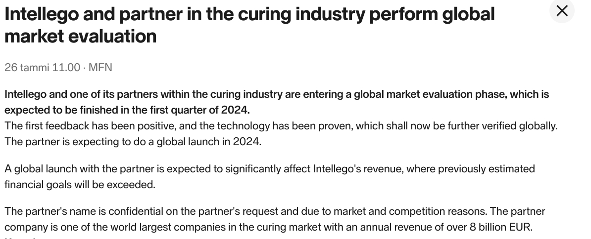 Osarin tärkein osuus sivulla 4 ensimmäisen kappaleen kaksi viimeistä lausetta. Onboarding prosessi “Henkel” kanssa suoritettu loppuun ja kansainvälinen myynnin aloitus vielä tänä vuonna. Tammikuun tiedotteen mukaan tällä myynnin aloituksella merkittävä vaikutus intellegon myyntiin.