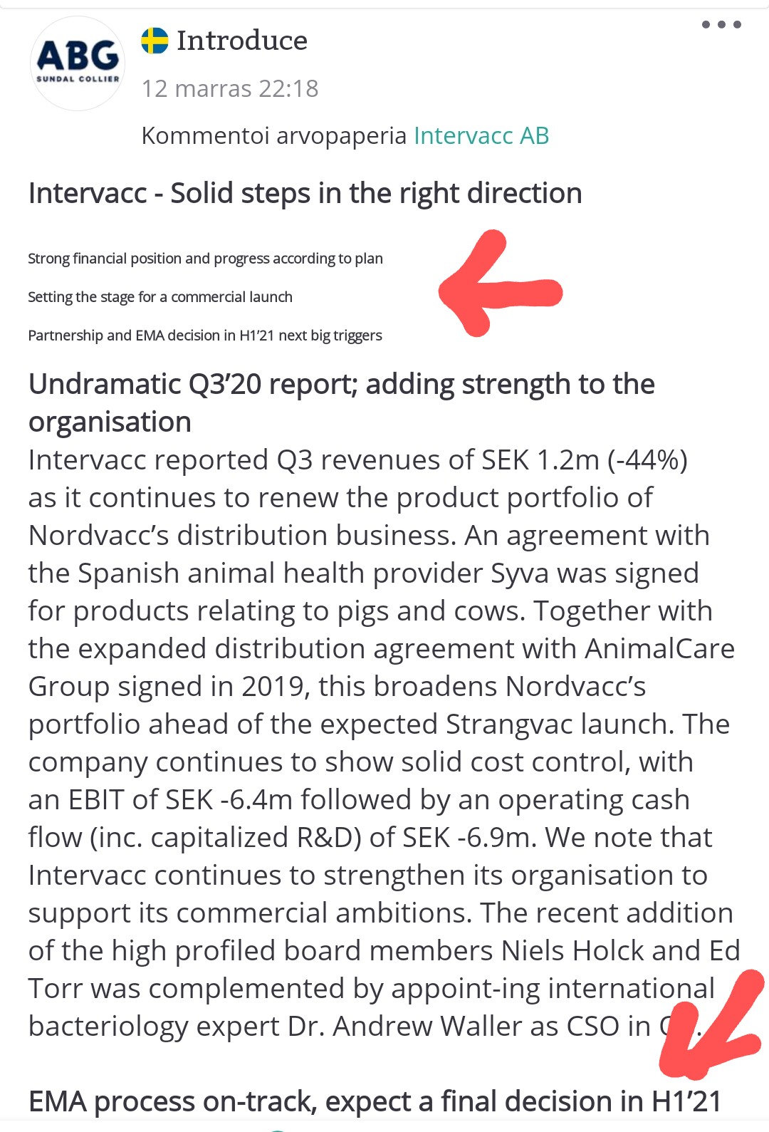 The valuation is based, among other things, on the assessment that Intervacc will be able to announce the outcome of the regulatory review of the Strangvac vaccine in Europe towards mid-2021, with the launch of Strangvac shortly thereafter.