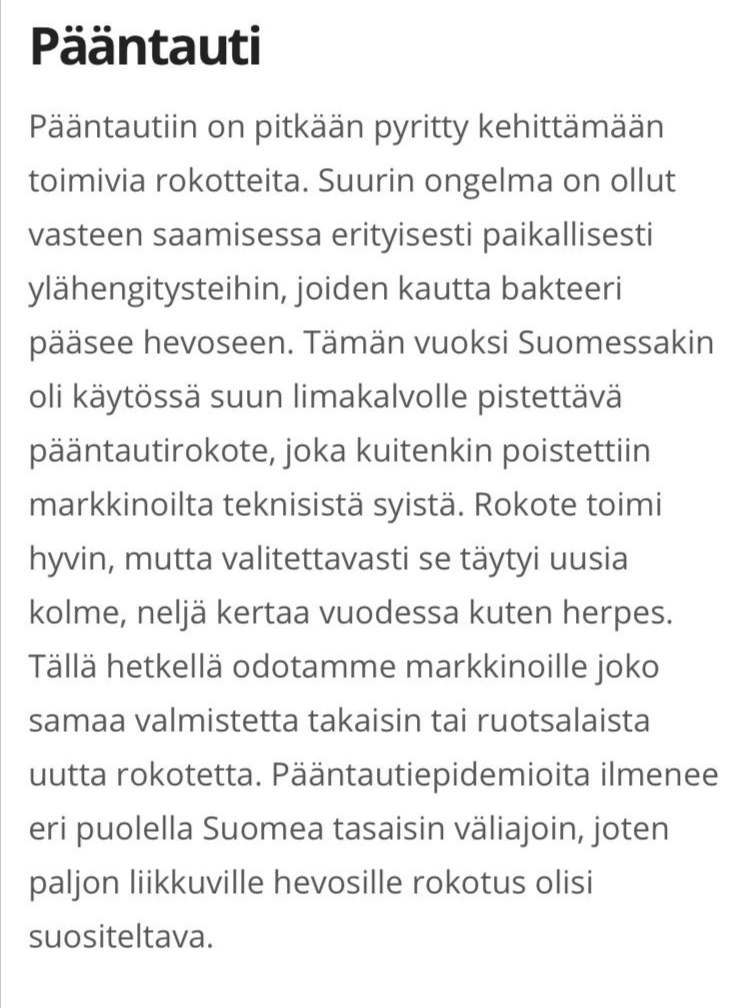 Hevosen pääntauti ilmeisesti kausi-influenssan kaltainen tauti, joka leviää tallilla jonne se pesiytyy. Yleensä tulee tuontihevosien mukana. Ilmeisesti myös vakava tauti joka kaataa hevosia. Uskoi että jokainen hevosenomistaja tämän kyllä hankkisi, jos toimiva rokote tulisi. Sivustaseuraajana olen saanut huomata miten paljon hevosen hoitoon ja ylläpitoon käytetään rahaa ja itse hevonen on todella suuri investointi. Rokote jolla turvataan oma investointi on pieni hinta kokonaiskustannuksista joita hevoseen uppoaa. HUOM nämä siis kaverin ja omia omakohtaisia ajatuksia.